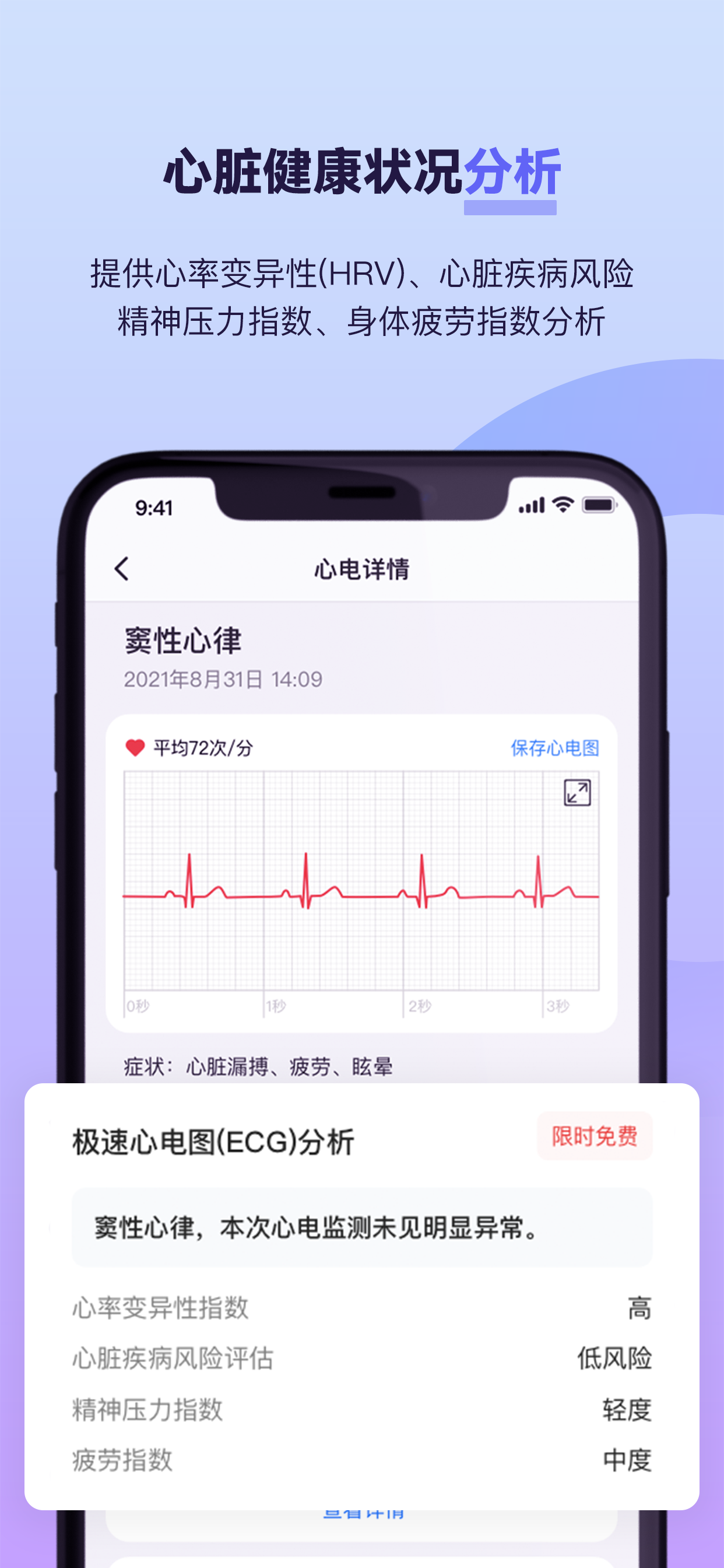 好絡維自主知識產權的智能心電大腦,針對Apple Watch測量的心電圖,可以進行房顫、室性早搏,房性早搏、室內阻滯、ST-T改變等多種心電異常情況分析,完整的分析報告還包括分析結論、心率分析、多項核心的心電特征指標、心率變異性、心臟疾病風險評估、精神壓力指數、疲勞指數等多種分析結論,可以給用戶更全面的參考。